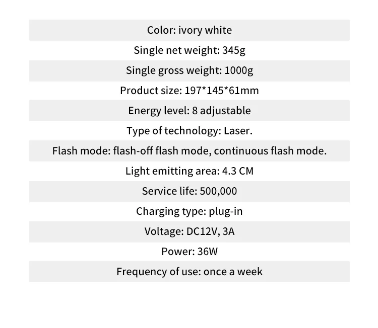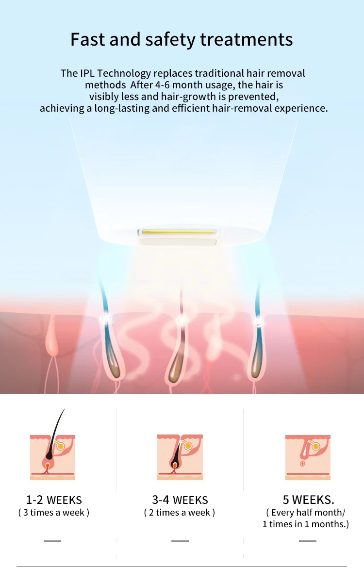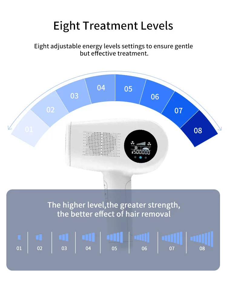 This hair removal device is a NEWEST IPL system, which only in the equipment used by professional salon and dermatologists currently, achieving permanent hair reduction in as little as 3 treatments. This IPL system targets the bulge area of the hair follicle, stops the follicle from getting nutrients and regenerating, and eliminates new hair growth.Freezing point physical cooling to maintain the body balance. Eight adjustment gears can be adjusted to choose the most suitable wavelength to avoid skin damage and increase hair removal effect