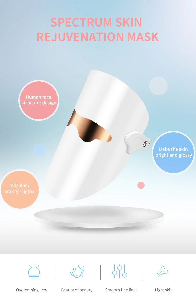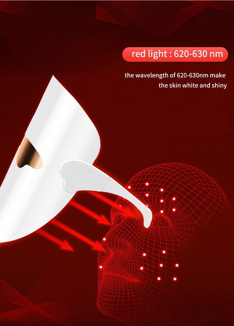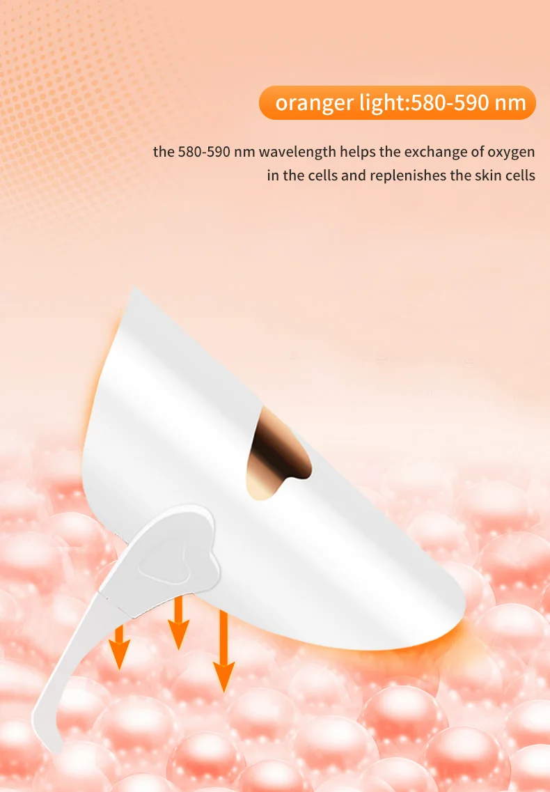 orange light:580-590 nm:with wave at 580- 590nm In combination with green and Red,it can eliminate face yellow,wrinkles, premature acne -prone skin; Accelerate the blood circulation function, promote the activation of skin tissue,improve oily skin, black, , acne, etc.