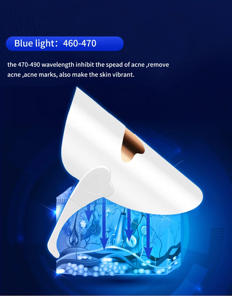 Blue light:460-470nm:with wave at 460-470nm can help to vasoconstriction, strengthen the protein fiber tissue, shrink pores, suitable for aging skin, easy wrinkle the skin, the symptom such as edema, activate the skin, the relaxation of skin contraction.