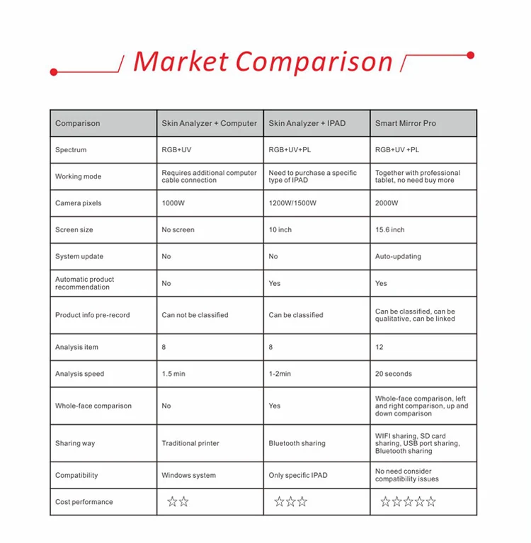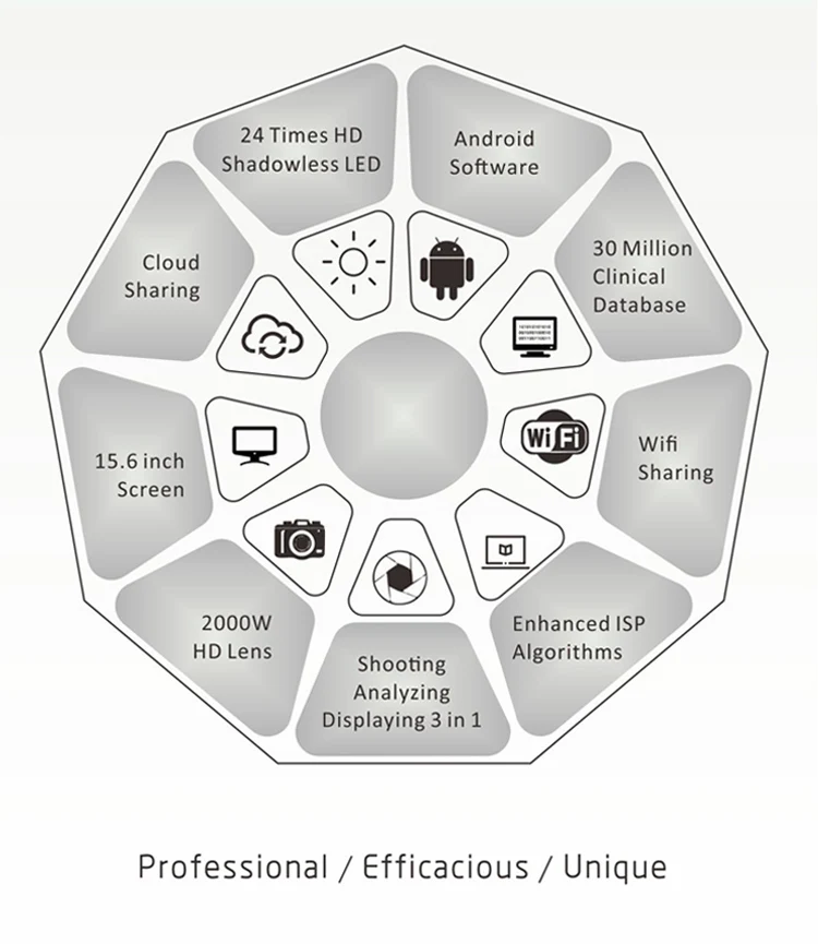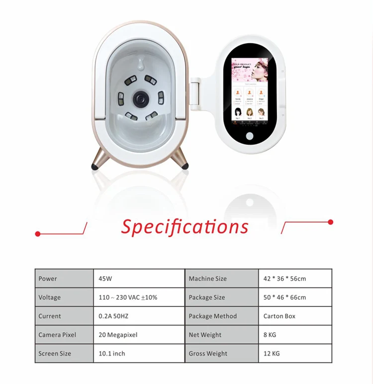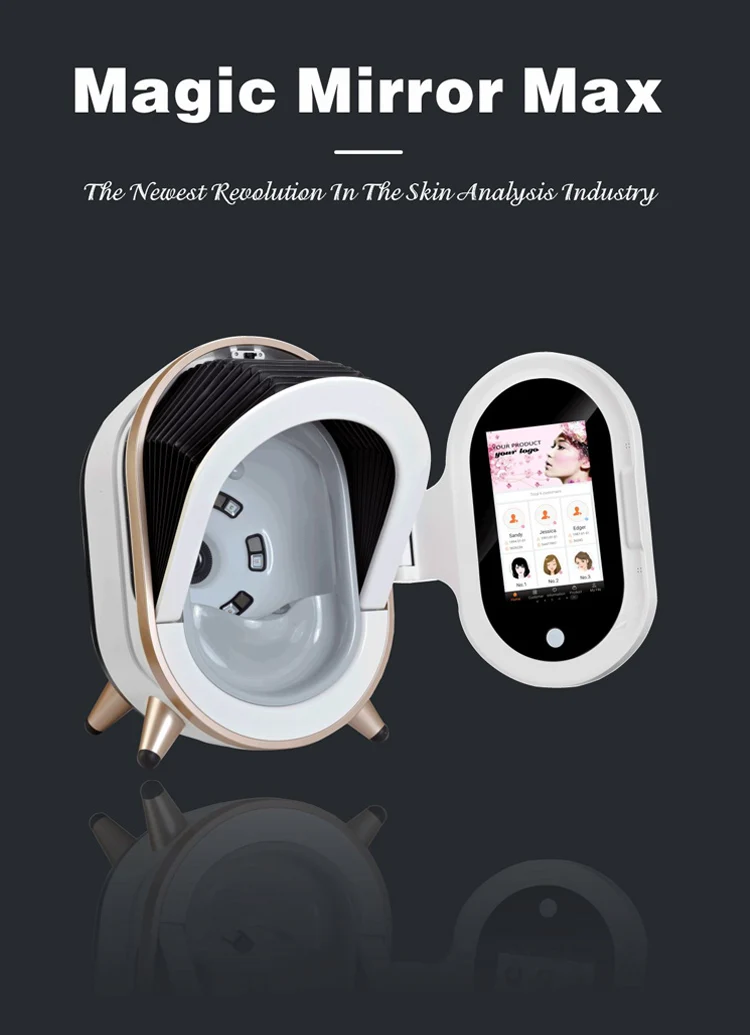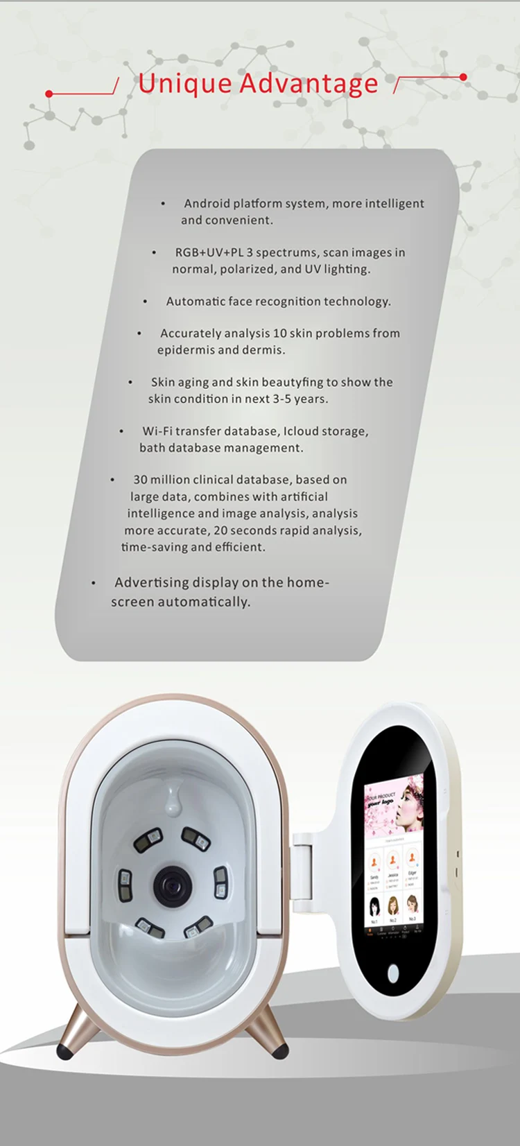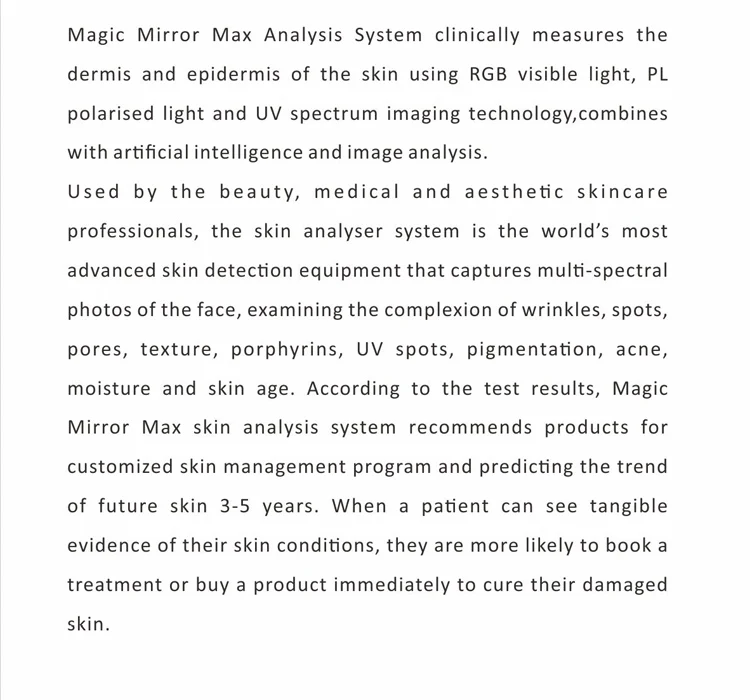 Magic Mirror Max is the world's most advanced skin detection equipment together with shooting, analyzing, displaying 3 in 1. It adopts RGB, UV, PL spectral imaging technology, combines with artificial intelligence and image analysis, 12 years market testing, 30 million clinical databases, achieving 15 seconds efficient skin analysis. Such as: spot, pore, moisture, texture, wrinkle and so on total 12 dermis and epidermis skin problems. According to the test results, Magic Mirror Max recommends products for customized skin management program and predicting the trend of future skin 3-5 years. It is an essential skin detection equipment for cosmetic company, beauty salon, skin clinic and training school, the market demand rate can be as high as 100%.