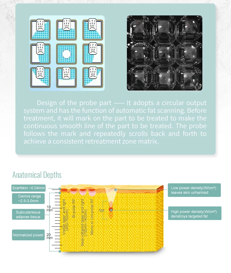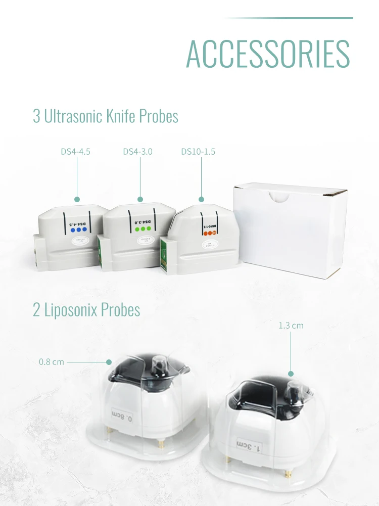 High Intensity Focused Ultrasound penetrates focused and volumetric ultrasonic energy at precise depth(13mm) in subcutaneous fat layers targeting fat tissue causing a non-thermal effect. The surrounding structures such as the epidermis, blood vessels and nerves will not be damaged. Meanwhile the metabolized contents (triglyceride, fatty acid) of cells willexcrete outside body automatically through blood circulation and lymphatic drainage without harm to the human body