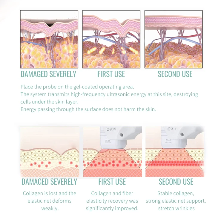 Ultrasonic focusing reaches the SMAS layer with its specific high-energy focused ultrasound, improves the SMAS suspension, comprehensively solve the facial sagging and relaxation problems. It accurately positions the ultrasonic power on the SMAS 4.5mm under skin, performing the best effect of shaping, pulling and compacting for muscle growth and traction; impacts on the collagen layer 3mm under skin, making the collagen restructured and newborn, solving the aging problems by recovering elasticity, skin whitening, wrinkle removing and pores shrinking.