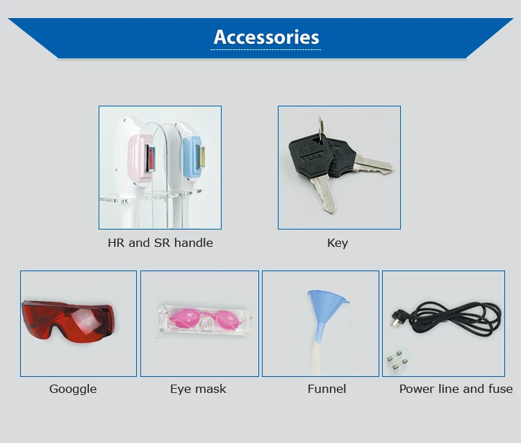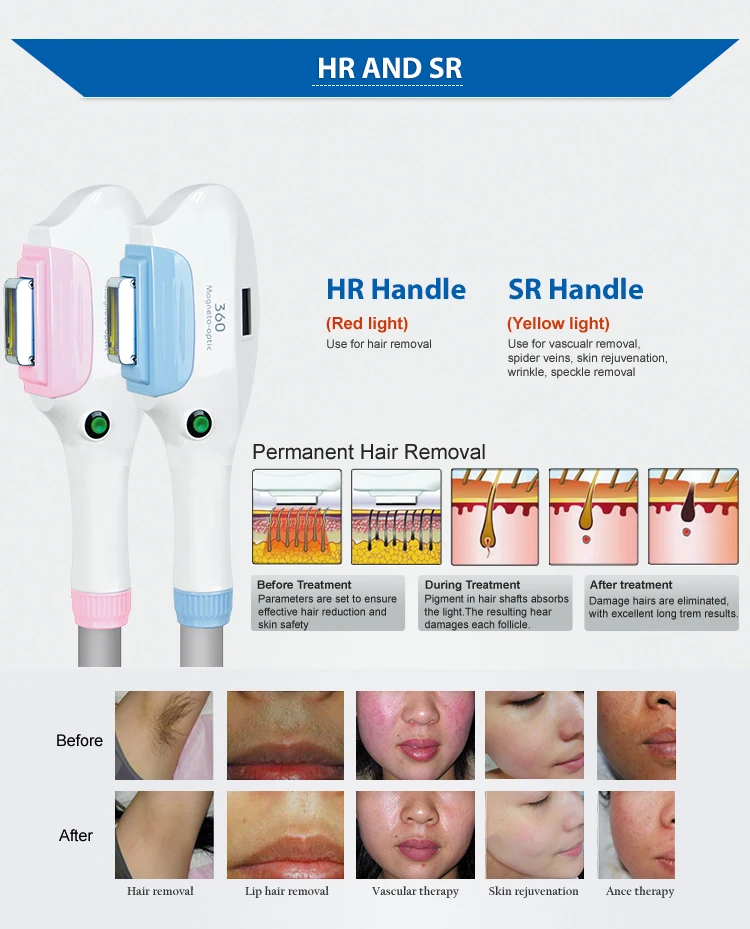<3> 2 treatment heads, HR&SR. HR is for hair removal; SR is for skin rejuvenation, eliminate speckles, sun spot, age spot, skin pigmentation,etc. HR treatment head for hair removal can remove unwanted hair completely and permanently. It can even completely remove white hair, and brown hair,etc. HR has big spot, It’s more convinient and faster to do treatment on large area of skin like leg and back.