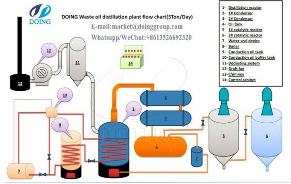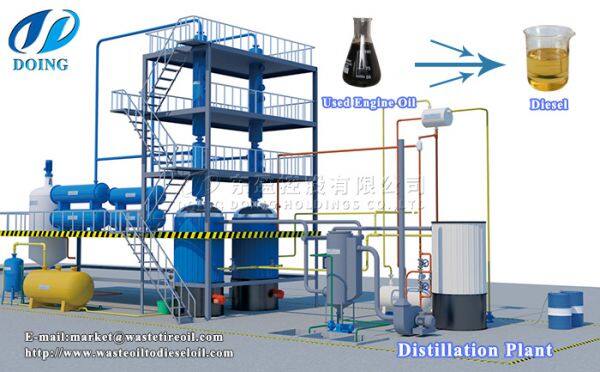 Used oil will be heated into oil gas with indirect heating in distillation reactor. Then oil gas will be cooled into diesel by cooling system. With the processing of color and odor removal system, diesel quality will be improved a lot.