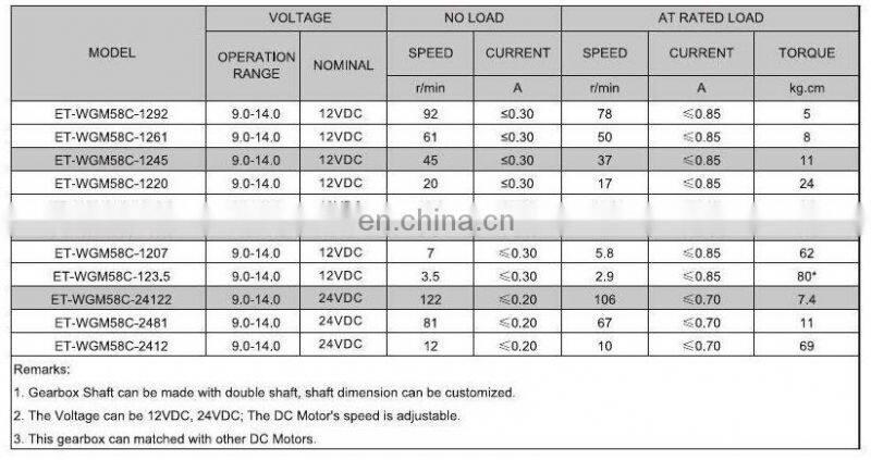 Notice: The above specification is just for reference. The gear motor's gear, shaft, speed, ratio, torque and motor type can be customized.