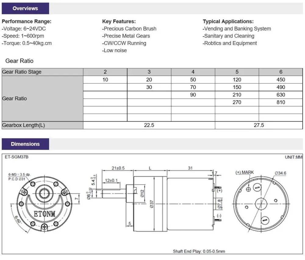 ETONM ET-SGM37G Gearbox Motor Reduction 37mm 12 Volt Dc Geared Motor 12v Dc Gear Motor