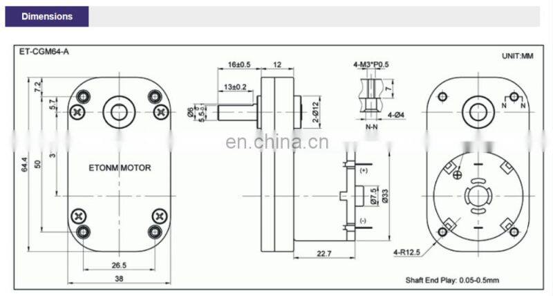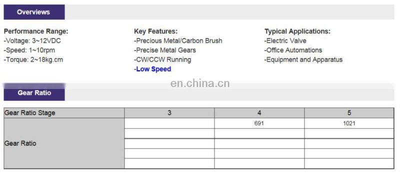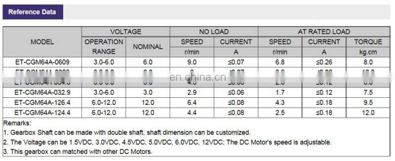 Notice: The above specification is just for reference. The gear motor's gear, shaft, speed, ratio, torque and motor type can be customized.