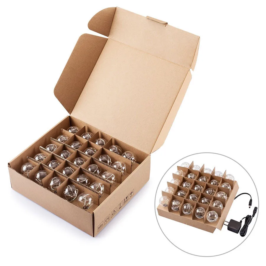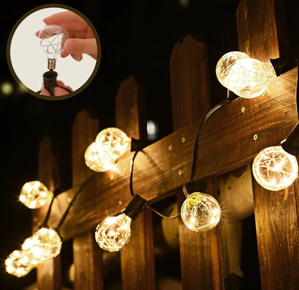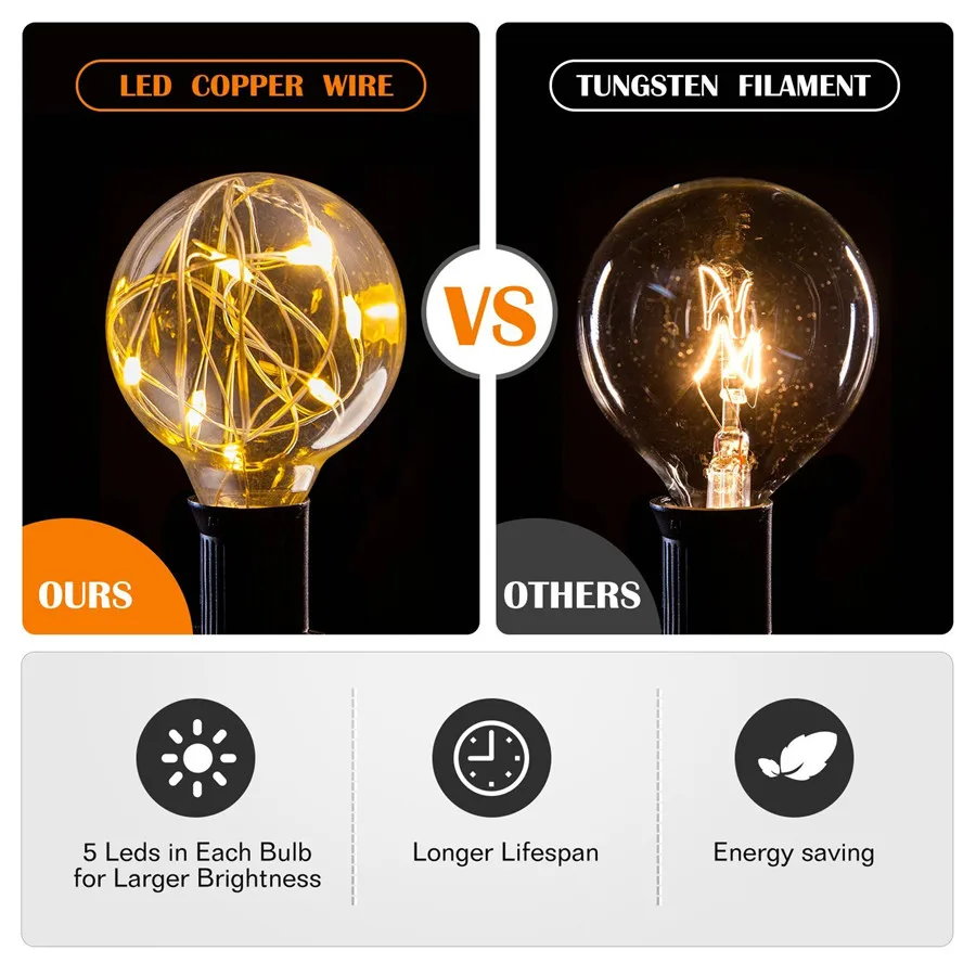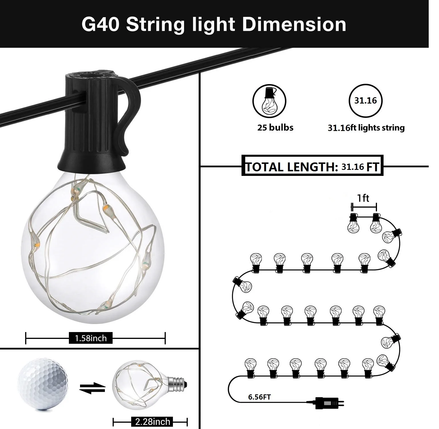 Feature: Bulb quantity: 25PCS Bulb distance: 30CM Quantity of LED: 5leds in each globe Input voltage: AC110V-240V Working Power:3W Bulb type: G40 Bulb size: 40*60mm Waterproof: IP44 Emitting Color: Warm white / White/ Multicolor Light Angle: 360 degree Item material: Copper string lights & PET bulb & PVC wire Plug style: US/EU Adapter: Waterproof adapter Wire color: Black Total Length: 10m Application: Party,Bar,Coffee,Dinner,Banquet,Wedding,etc Specification: -10 meters ( 33 feet ) long strings with 25 globe E12 G40 Bulbs - Great for patios, decks, weddings, tents and parties - Perfect for any special occasion, adding a warm and charming festive accent to your gatherings - With updated energy-efficient bulbs - Bulb count: 25 bulbs - Bulb type: G40 - Socket type: E12 - Lumens: 480LM