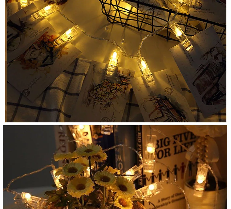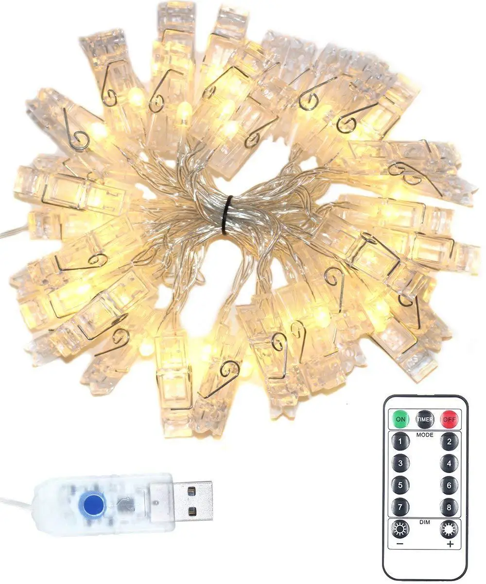 Product Descriptions:One button operation design, it is more convenient to use.Be super bright and low power consumption.Semi-conductor chip light, be breakage-proof and shake-poof.Be suitable for home, hotel, garage, car, motorcycle, Christmas, weddings, Valentine’s Day, party, pub, concert, fashion show, window display, etc.Easy to install on most surfaces: walls, windows, doors, floors, ceilings, grasses, glass, wood, metal, plastic, Christmas trees, etc. Product Specifications:Item Name: USB Garland Card Photo Clip String LightsLED Color:Warm white (2800K-3000K)Total length:5MeterQuantity of led bulbs: 40 ledsInput Voltage: USB 5V 500MALifespan: 50000 hoursWire Color: transparent Package:1* USB Card Photo Clip String Light