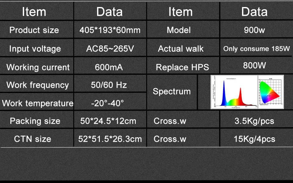 Specifications:Full spectrum for vegetative and flowering stage: 430~440nm, 450~475nm, 620~630nm, 650~670nm, White, IR(730nm)LEDs: 90PCS Diamond 10W grow LEDsLED Power : 90X10W=900wActual Power consumption: energy saving, just consumes about 190W-230W power, much better than the same product in the marketplaceDimension: 405x193x60mmCoverage Area: about 4.4 x 4.8 Square Feet ( The lighting area and the height are changeable according to different plants andenvironments )Lifespan: >50,000hoursWorldwide Voltage: 85v-265vWorking environment : -20~40degrees,45%~95%RHWorking Frequency: 50~60HzModular Power Cord Warranty: 2 Year