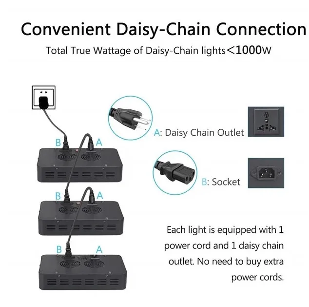 This double switch series grow light , different button fit for differnet waterfall stage of your plant. VEG button fit for germination stage and BLOOM button fit for flowering stageFull spectrum design meet the needs of plant growthWe have professional laboratories and researchers, and carry out a large number of experiments and tests on the ratio of lamp beads to ensure the scientific and effective spectrum.High PPFDThe 600W PPFD value is 255.7 umol/m2s hanging at 18 inch.The higher the PPFD value, the better the plant growth