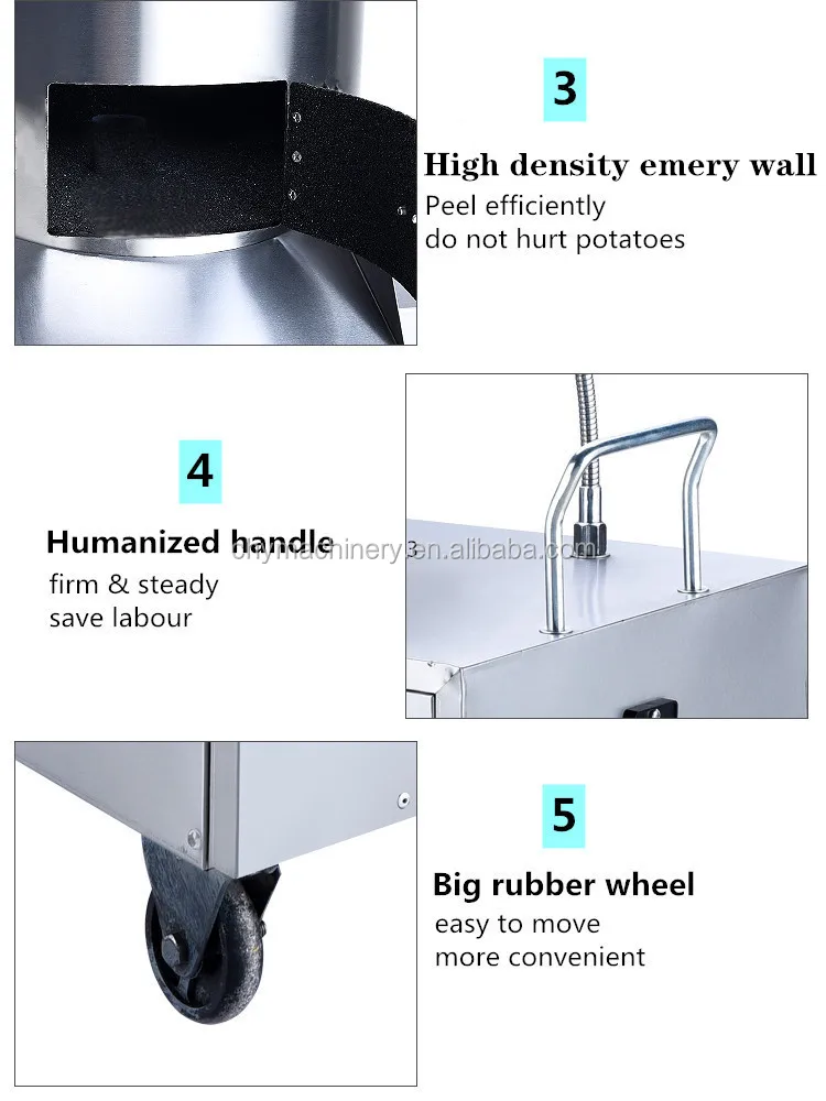 YQ series potato washing & peeling machine is specially designed for washing and peeling potatoes, simple and safe to use, easy to clean. It can peel potatoes, carrots, turnip, ginger, taro, sweet potato, beet, radish, turnip, onion and other root vegetables and fruits. It adopts emery grinding principle, make it more efficiency, peel the potatoes into nice appearance.