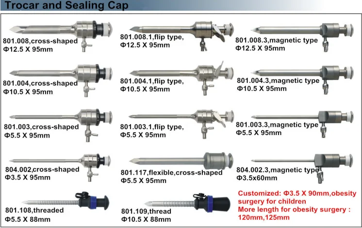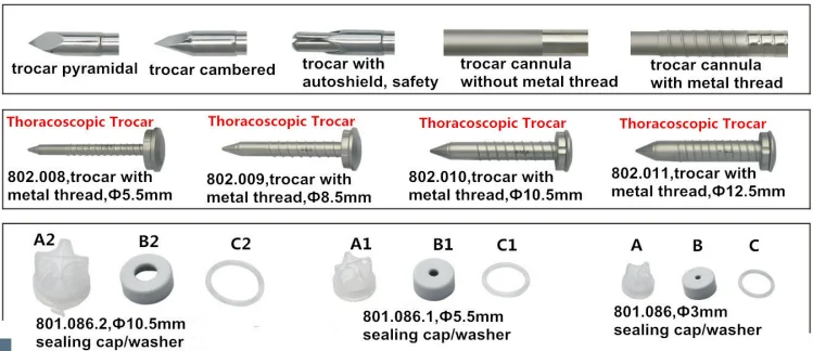 1. All stainless steel trumpet valve body trocar sleeves with insufflation port. | ||||||||