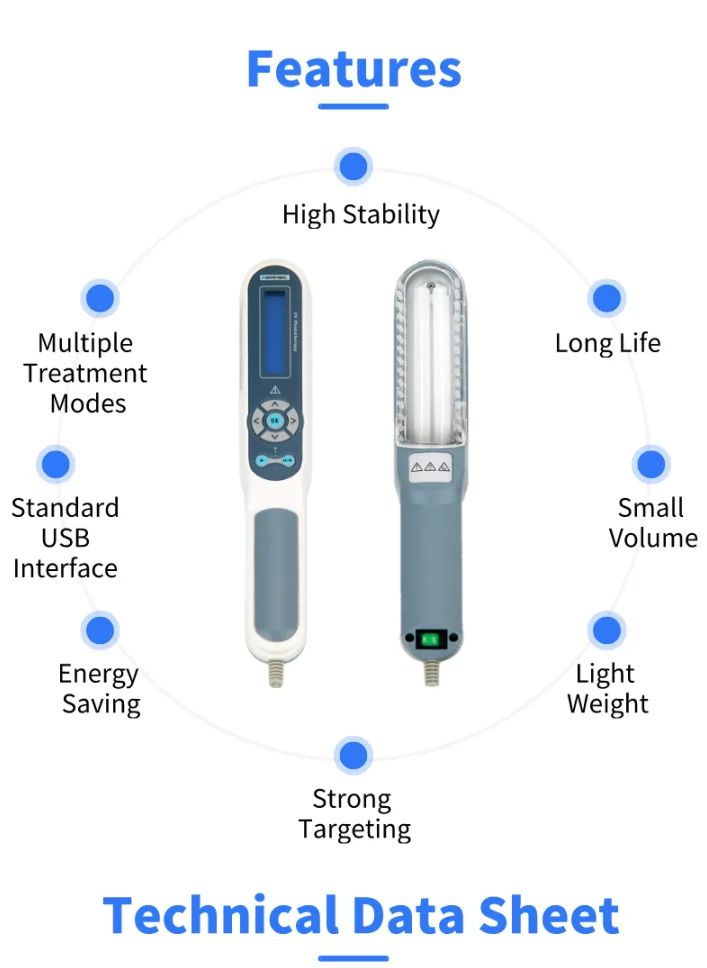Scope of Application | It is suitable for clinical units or under the guidance of doctors, for dermatological patients to treat vitiligo, psoriasis, pityriasis rosea, and eczema skin diseases by themselves at home. |
