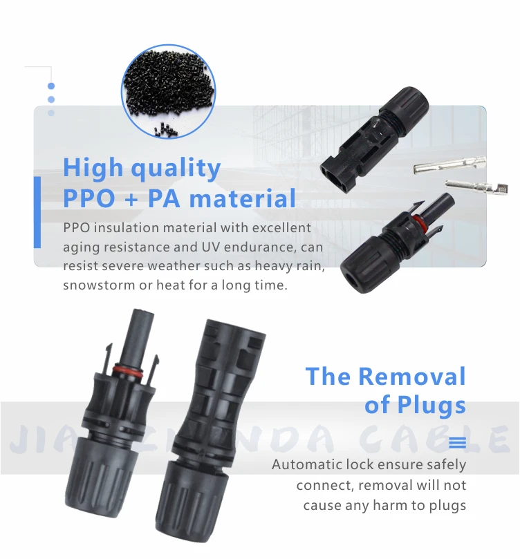 1. Solar Connector Conductor pin is tinned Copper: made of PPO + PA material, It makes a rock-solid connection after you crimp the pin to the wire. PPO INSULATION MATERIAL with excellent aging resistance and UV endurance can resist severe weather such as heavy rain, snowstorm or heat for a long time.