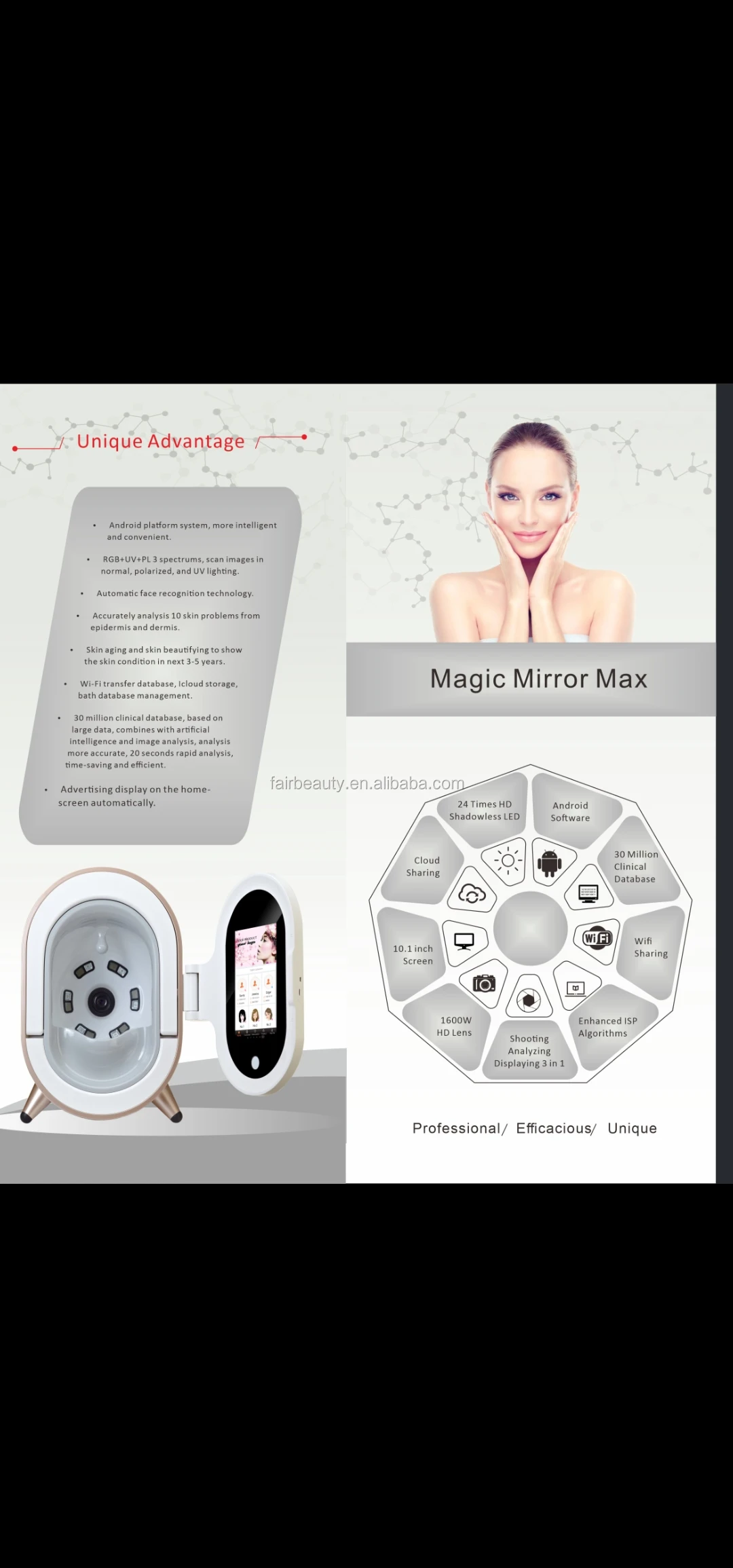 Magicical Mirror Plus is the world's most advanced skin detection equipment together with shooting, analyzing, displaying 3 in 1. It adopts RGB, UV, PL spectral imaging technology, combines with artificial intelligence and image analysis, 12 years market testing, 30 million clinical databases, achieving 15 seconds efficient skin analysis. Such as: spot, pore, moisture, texture, wrinkle and so on total 10 dermis and epidermis skin problems. According to the test results, Smart Mirror Pro recommends products for customized skin management program and predicting the trend of future skin 3-5 years. It is an essential skin detection equipment for cosmetic company, beauty salon, skin clinic and training school, the market demand rate can be as high as 100%.