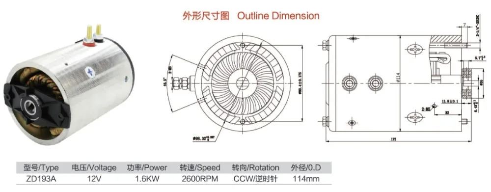 This type ZD193A is a 12v 1.6kw dc motor with carbon brush .It is composed of a stator magnetic pole, a rotor (armature), a commutator (commonly referred to as a commutator), a brush, a casing, a bearing, and the like.
