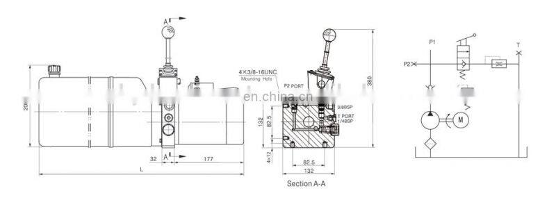 This power unit is designed exclusively for the fork lift, consisting of high pressure gear pump, DC motor, multi-functional manifold, valves, tank, ect.The up and down movements are controlled by the level of the mannal release valve, which is equipped with an electric switch for the motor start.The lowering speed is automatically adjusted by the pressure compensated flow control valve.