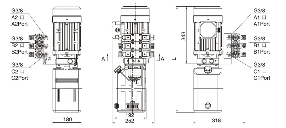Model | Motor Volt | Solenoid Valve Volt | Motor Power | Rated Speed | Displacement | System Pressure | Tank Capacity | L (mm) |
