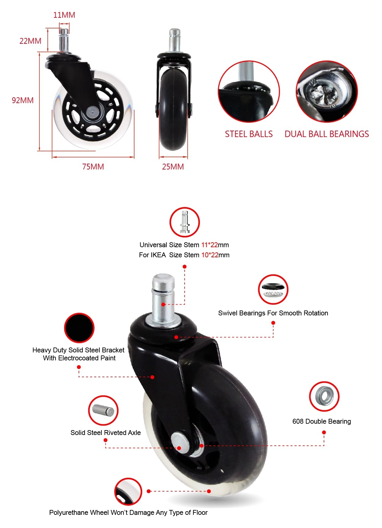 Home > Industrial Equipment & Components > Bearing > Spherical Roller Bearing > Low Noise Easy Fast Install Office Furniture PU Castor Roller Wheel