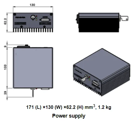 Dimensions of laser and power supply (mm):