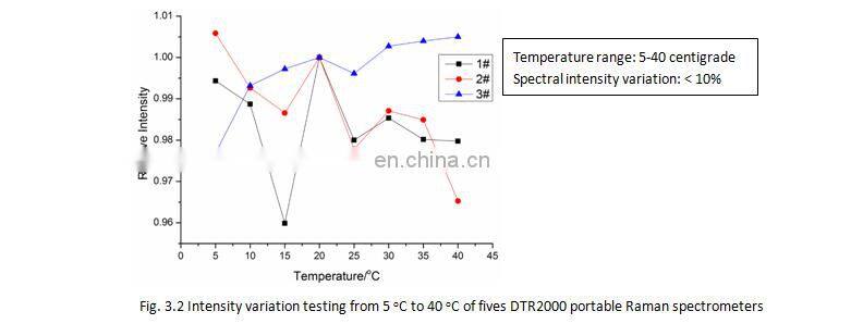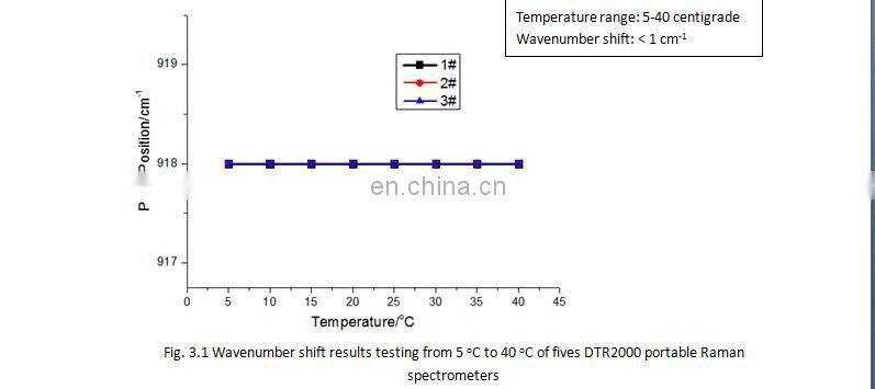 Figure 3.1 and Figure 3.2 showed the temperature reliability testing results of fives DTR2000 portable Raman spectrometers. The testing temperature range was from 5 oC to 40 oC. The spectrometer was kept more than 1 hour at every temperature spots. Acetonitrile was used as the standard sample in the testing. The testing results were calculated using 918 cm-1 of acetonitrile. The wavenumber shift was 1 cm-1 or less(as show in Fig. 3.1). The peak intensity variation was less than 10% (as show in Fig. 4).