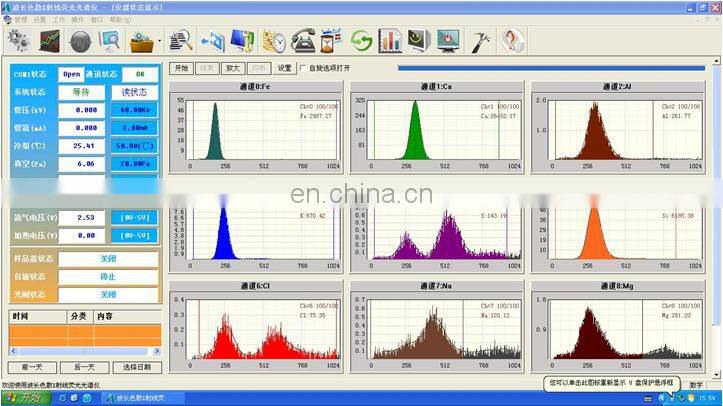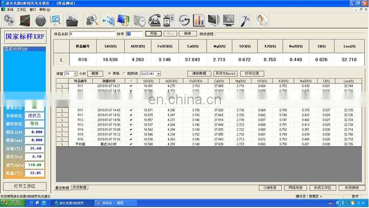 This instrument is a simultaneous wavelength dispersive spectrometer, which can load more than 10 (including 10) analysis channels for simultaneous determination of multiple elements. The elemental analysis ranges from Na to U and 10 major elements in the cement, i.e., Ca, Fe, Si, Al, Na, Mg, S, K, Cl, P can be preset. The analysis speed is less than 2 minutes. The input power supply is single-phase 220/240vac, which also supply power to the PC and printer.