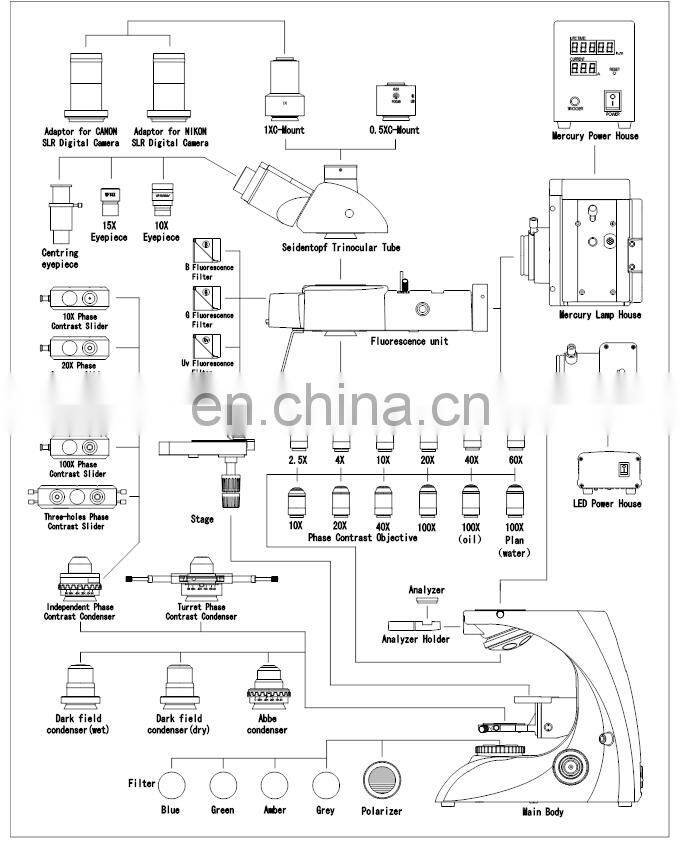 Fluorescence Attachment | Epi fluorescence unit ( six-hole disc media which can be fixed with Uv /V/B/G and another filters) ,100W mercury lamp. | O | |