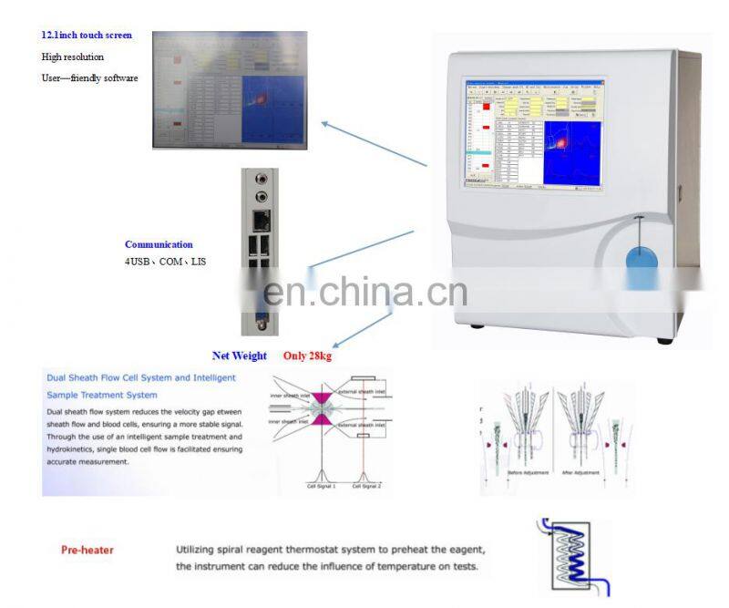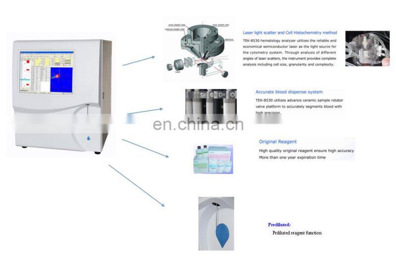 hematology analyzer utilizes the reliable and economical semiconductor laser as the light source for the cytometry system. Through analysis of different angles of laser scatters, the instrument provides complete analysis including cell size,granularity and complexity.