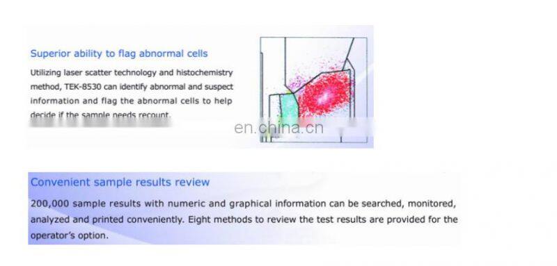Utilizing laser scatter technology and histochemistry method, TKE8510 can identify abnormal and suspect information and flag the abnormal cells to help decide if the sample needs recount.