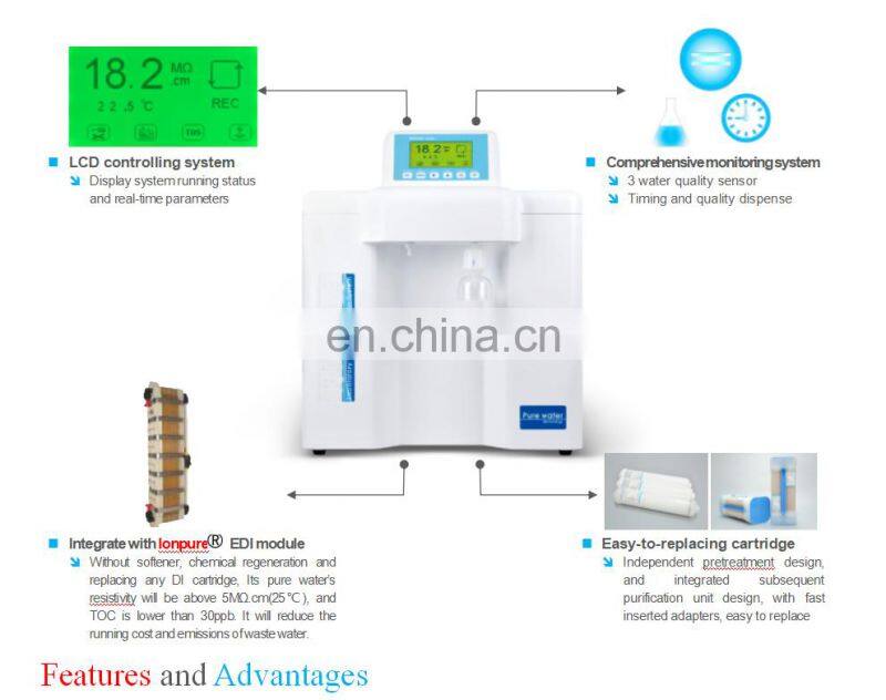 The deionized water is stable grade II pure water with resistivity>5MΩ.cm(25℃), TOC<30ppb, and the lowest running cost. It completely meets the requirements of general chemical or biological experiments for pure water, and is up to the standard of ISO 3696(Type II), ASTM D1193 (Resistivity of type II and TOC), and the requirements for pure water of CLSI (NCCLS) clinical laboratory, GB/T6682, America, Europe, Japan’s pharmacopeia.