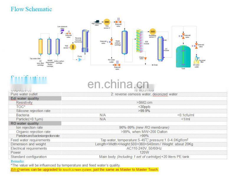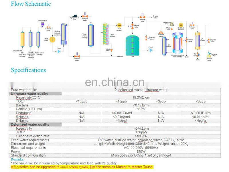 With LCD controlling system, 3 way water quality sensor, timing and quality dispensing, single stage RO system,2 pump and IonpureEDI module, Edi-S ultrapure water system is superior choice of ultrapure water for high grade experiments.