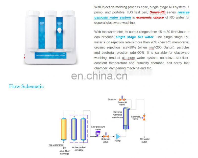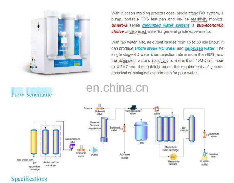 With injection molding process case, single stage RO system, 1 pump, portable TDS test pen and on-line resistivity monitor, Smart-S series ultrapure water system is sub-economic choice of ultrapure water for high grade experiments.