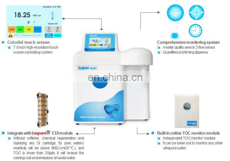 With 7.0 inch touch screen system, 4 way water quality sensor, 3 way flow sensor for quantified dispensing, Ionpure EDI module, built-in TOC module, 2 stage RO and 3 pump system, Super series is top choice of ultrapure water for high grade experiments.
