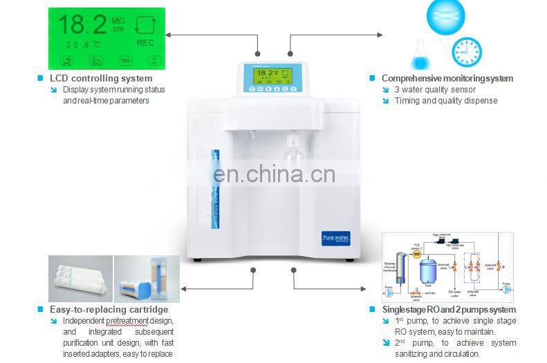 Water dispensing function- timing and quality (time range: 1-99min, water quality range: 0.1-18.2MΩ.cm).