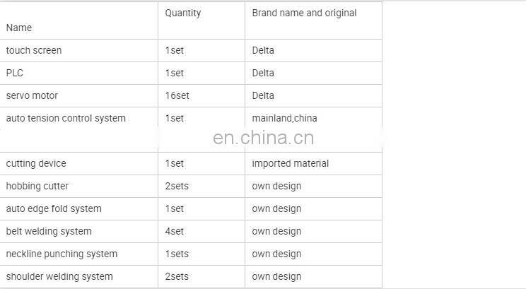 2)from material feeding to belt .welding .neckline cutting .folding .cuff cuttting .shoulder welding .forming and cutting .etc.