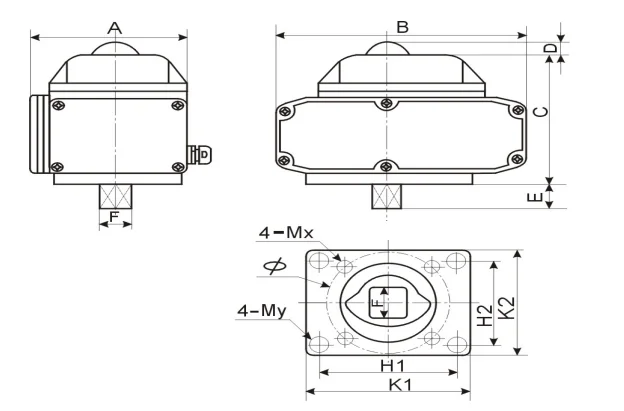 Model | A | B | C | D | E | Square | K1 | K2 | H1 | H2 | Mx | My | Φ |