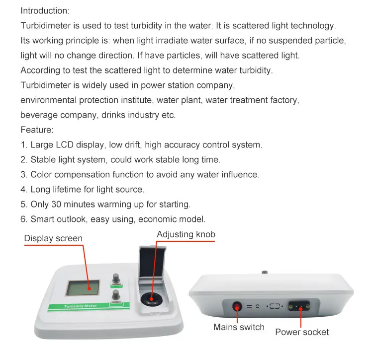 Turbidimeter is used to test turbidity in the water. It is scattered light technology. Its working principle is: when lightirradiate water surface, if no suspended particle, light will no change direction. If have particles, will have scattered light.According to test the scattered light to determine water turbidity. Turbidimeter is widely used in power station company,environmental protection institute, water plant, water treatment factory, beverage company, drinks industry etc.