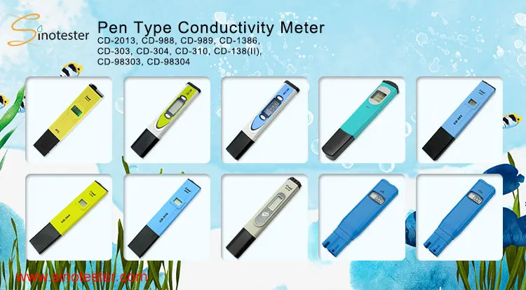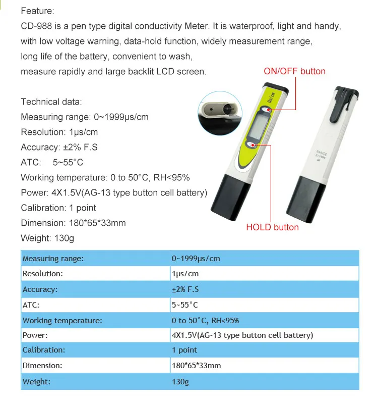 CD-988 is a pen type digital conductivity Meter. It is waterproof, light and handy, with low voltage warning, data-hold function,