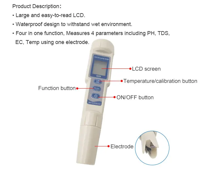 Home > Instruments & Meters > Analysis Instrument > pH Meter > 4 in 1Water Quality Tester Digital TDS/TEMP/ EC/PH Meter Monitor Kit TDS Water Tester With Backlight For Pools Drinking Water