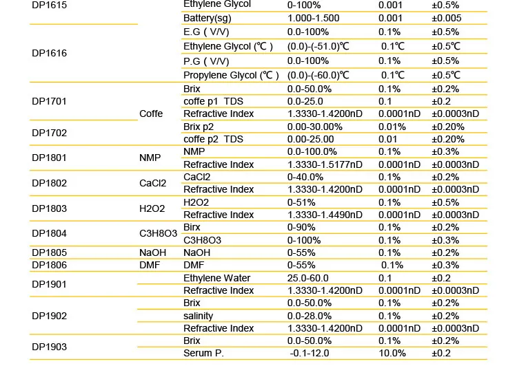 | Measurement Accuracy | 0.0001 | Brix Min. Div. | 0.1 % | |