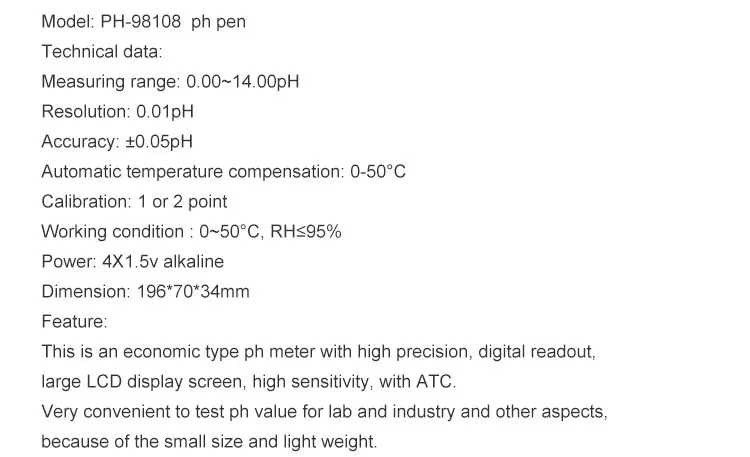 Feature: This is an economic type ph meter with high precision, digital readout, large LCD display screen, high sensitivity, with