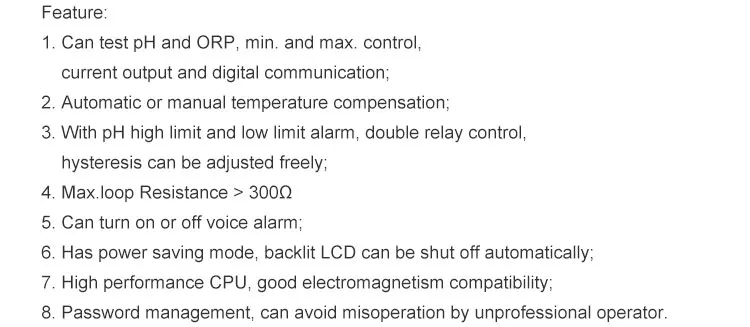 3. With pH high limit and low limit alarm, double relay control, hysteresis can be adjusted freely;