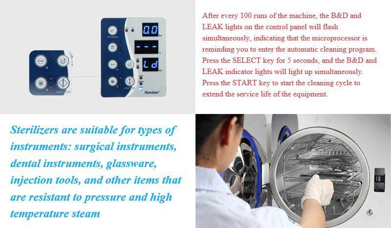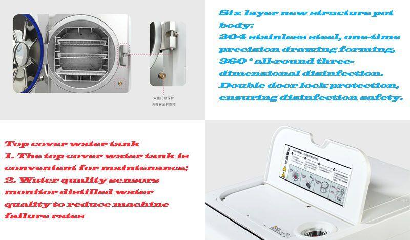 LED display screen, European B standard, sterilization temperature 121 ℃/134 ℃, built-in USBB&D/Helix testing program, leak testing program, double door lock system, more reliable open water tank.
