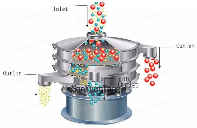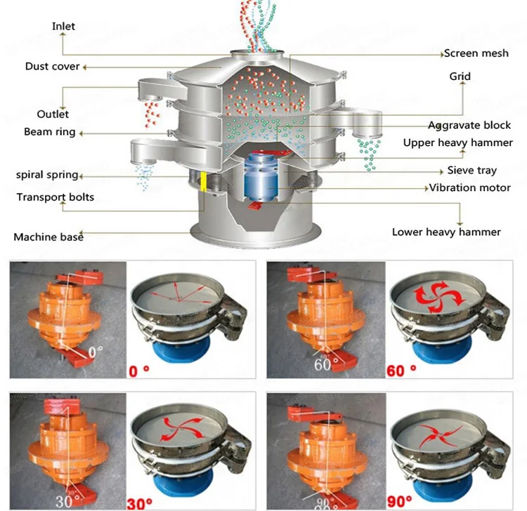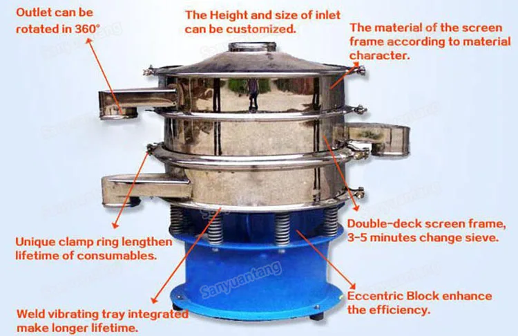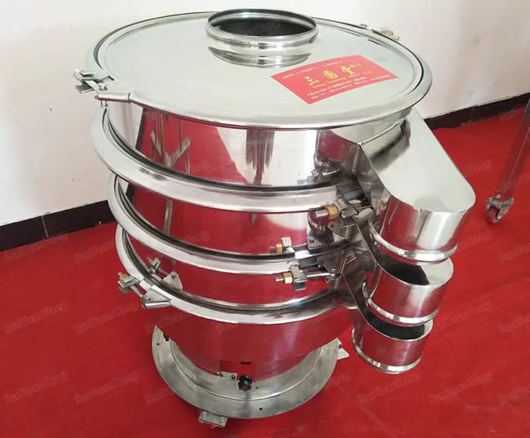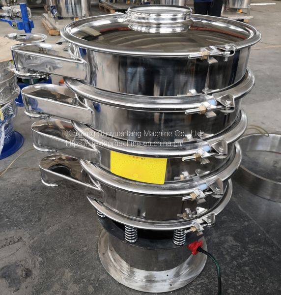 Rotary Vibrating Screen is a high-precision powder griddle, low noise, high efficiency, quick changer takes 3-5 minutes, totally enclosed structure, for grain, flour, mucus and other materials screening filter. Rotary Vibrating Screen is a motor for vertical excitation source, the motor and lower eccentric weight installed at both ends of the motor rotary motion into a horizontal, vertical, inclined three elementary motions, then the movement passed to the screen surface . Adjust the upper and lower ends of the phase angle, the material can change the trajectory of the screen surface.