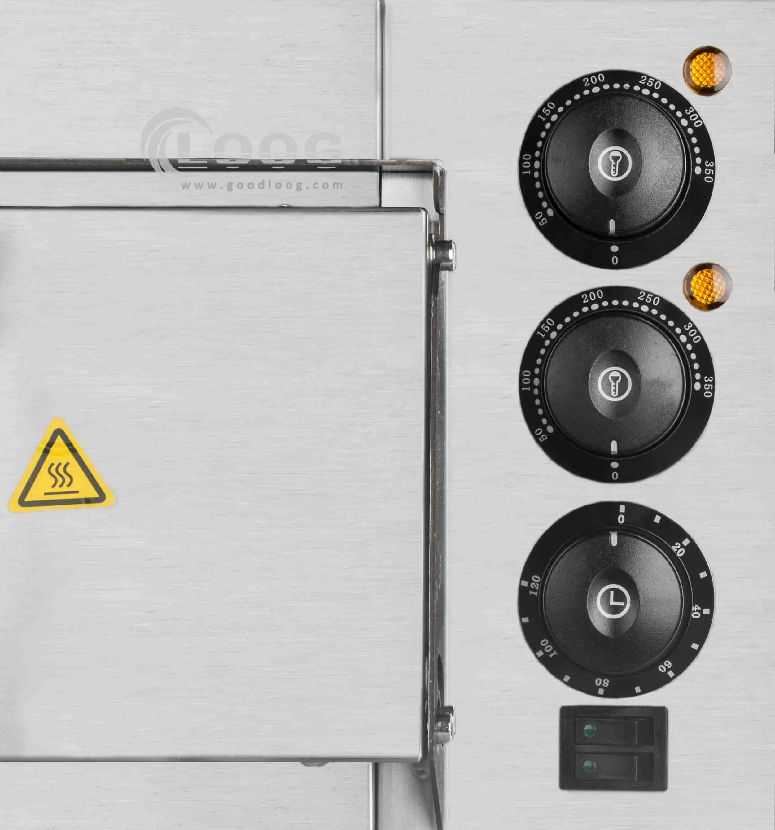 Temperature Set at 50-350 Centigrade, two temperature controls control the upper and lower layers of food The timer set at 0-120 Minutes, it will alarm when the food have done, you can busy with other thing after set the time.