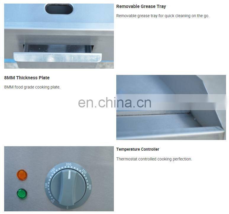 Our commercial electric countertop griddle with thermostatic controls delivers superior cooking performance no matter what's on the menu! A throttling thermostat adjusts from 50°C to 300°C to provide a quick response to surface temperature change. The heavy duty knobs ensure accurate temperature adjustment of +/- 10°C from the set point, while it's highly polished 8mm thick griddle plate distributes heat evenly and recovers quickly. This 55cm wide commercial electric griddle is built with durability and convenience in mind, with a stainless steel control panel, cool-touch front and splash guard. Other user-friendly features of our commercial electric griddle include a front grease trough and grease chute for easier cleaning, and a large stainless steel grease drawer, to ensure the griddle is securely fastened to the countertop.