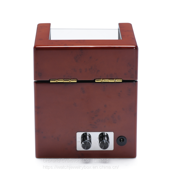Material: Wooden box paint in high glossy; Japan MABUCHI motor; Silver metal hinges for connecting the cover and box; One watch holder; A lid with transparent acrylic window, 4 programs fixed; AC/DC operated.