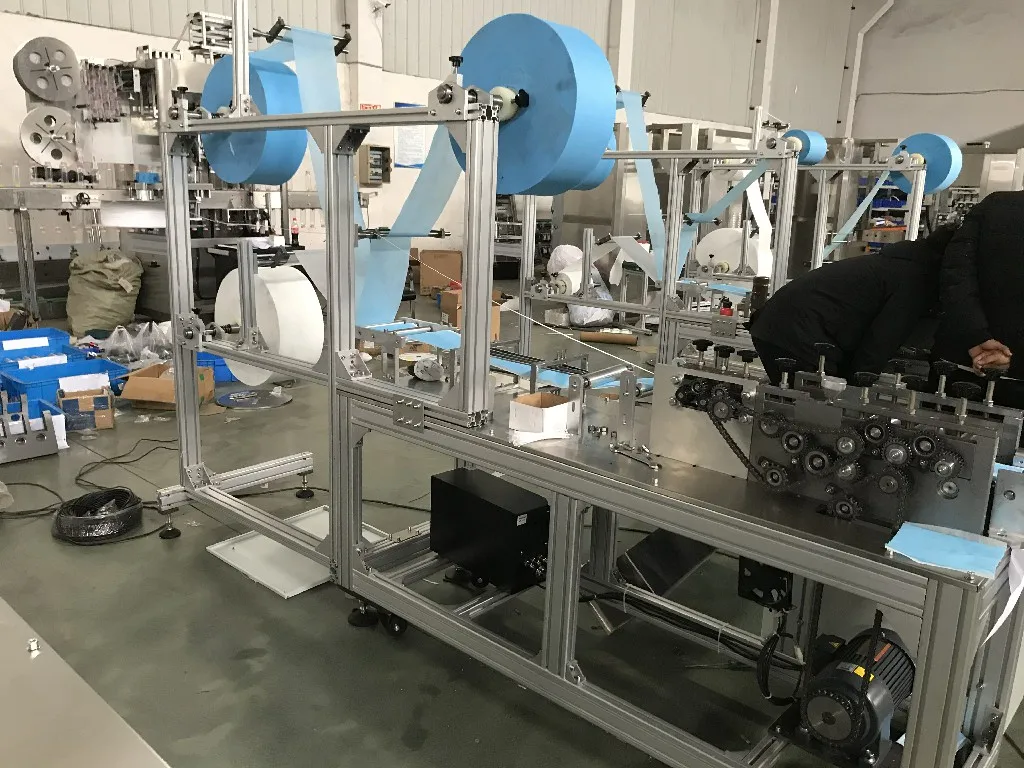 The production line realizes the automated production of masks. The main process flow includes coil material feeding, nose bridge tendon feeding, folding and pressing, mask cutting and forming, ear band feeding and welding, and finished product unloading. Automatically complete the production from raw materials to finished masks. The produced masks have wearing comfort, no pressure, good filtering effect of masks, fit to the face shape of people, and can be used in the medical industry.