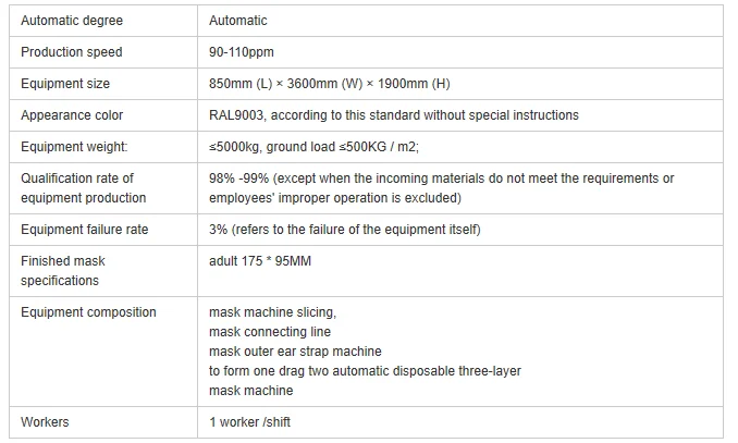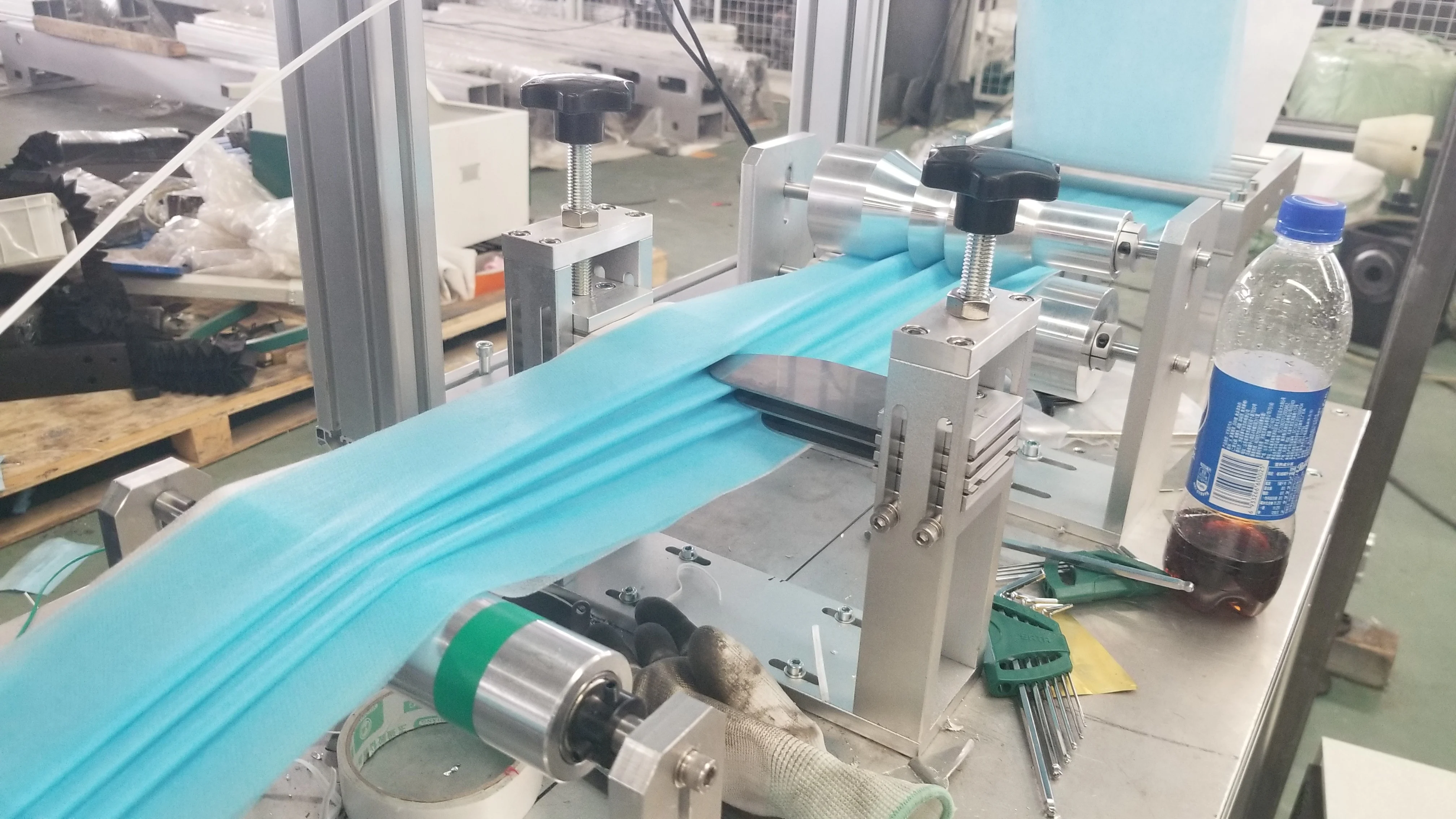 This machine is mainly used for the automatic forming of flat masks: the whole roll of fabric is driven by rollers after unwinding, and the fabric is automatically folded and hemmed; the entire length of the bridge is pulled and unrolled. Ultrasonic welding to the seal, then ultrasonic side sealing, cutting and shaping with a cutter; conveying the mask to the two mask earband welding stations through an assembly line, and finally forming the mask by ultrasonic welding; when the mask is made, The pipeline is transported to the flat belt line for collection.